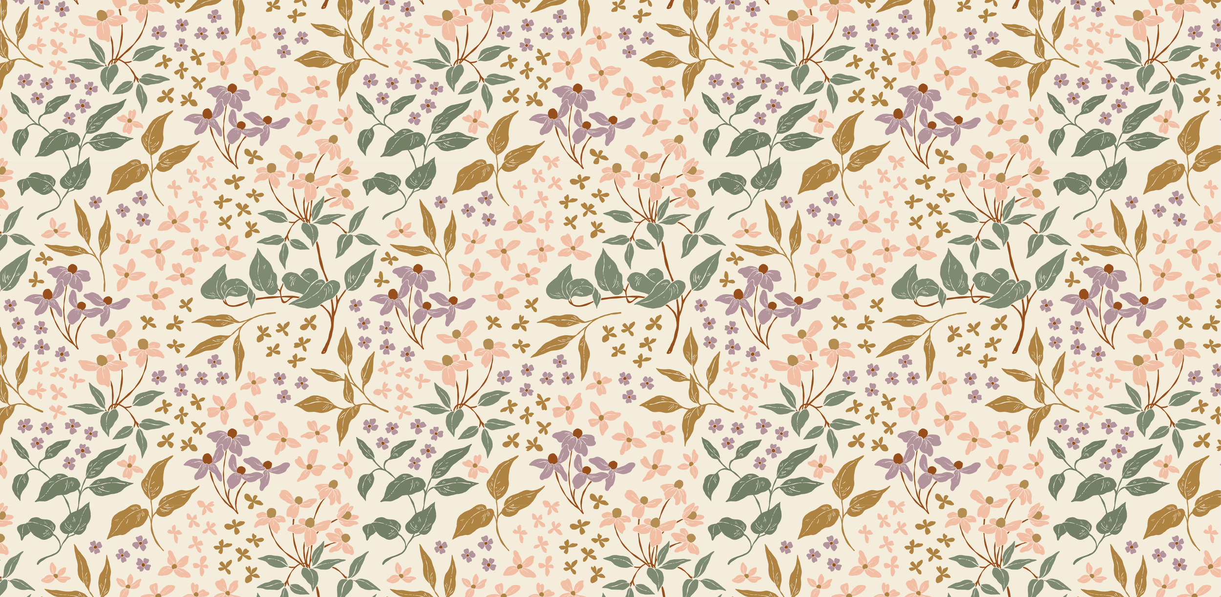 This collection is inspired by one of my favourite flowers - the Clematis. During a drawing trip to Cornwall, I snapped a photo of Clematis trailing up a fence on the coast path. That photo became the reference for several pages in my sketchbook, which later became these floral motifs and repeat patterns. The colour palette is made up of the pink and mauve hues of the florals themselves, green foliage, and the brown and ochre tones of the fence and gravel path.
